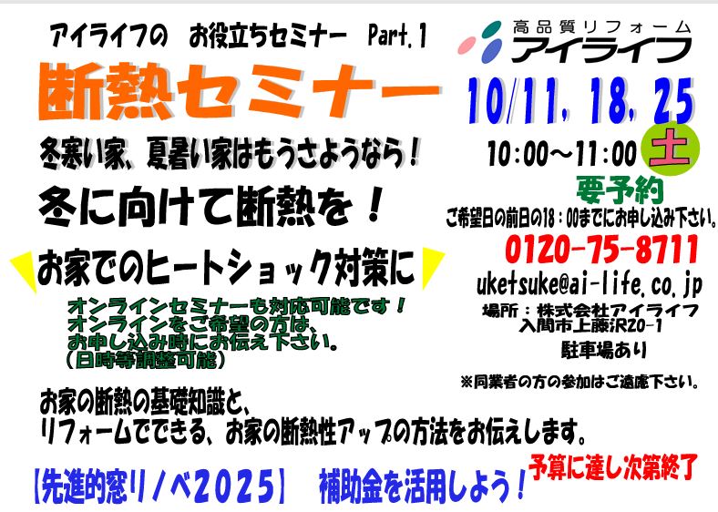 断熱セミナー開催 10月11日(土)・18日(土) 25日(土)10:00~ 先進的窓リノベの説明含む