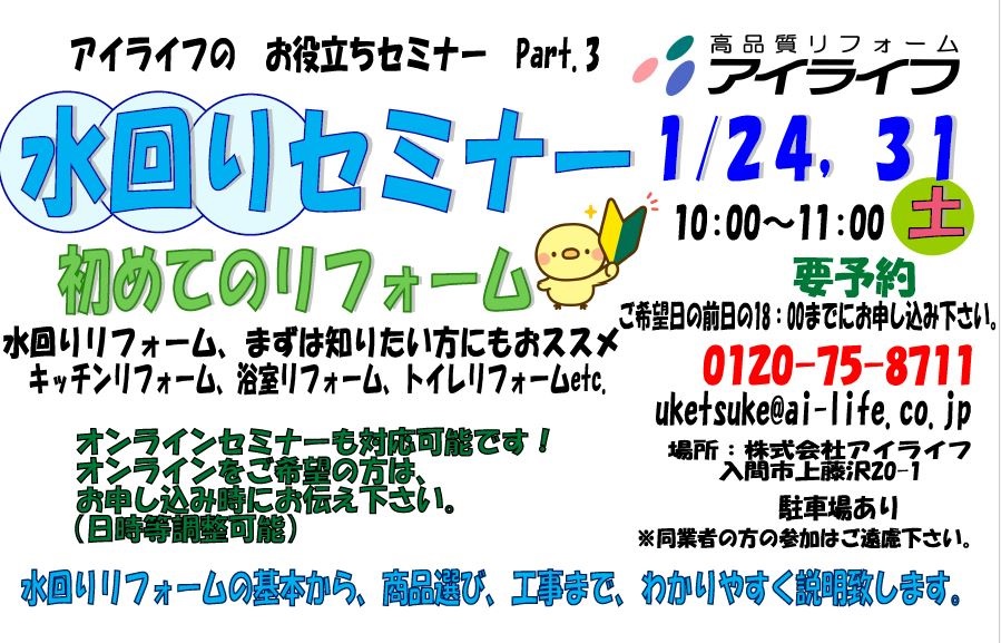 水回りセミナー開催 1月24日(土)・31日(土)10:00~