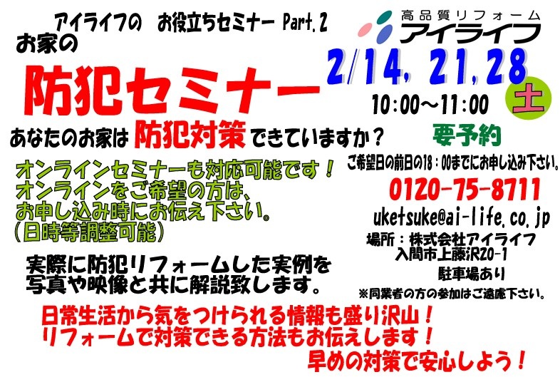 防犯セミナー開催 2月14日(土)・21日(土)・28日(土)10:00~